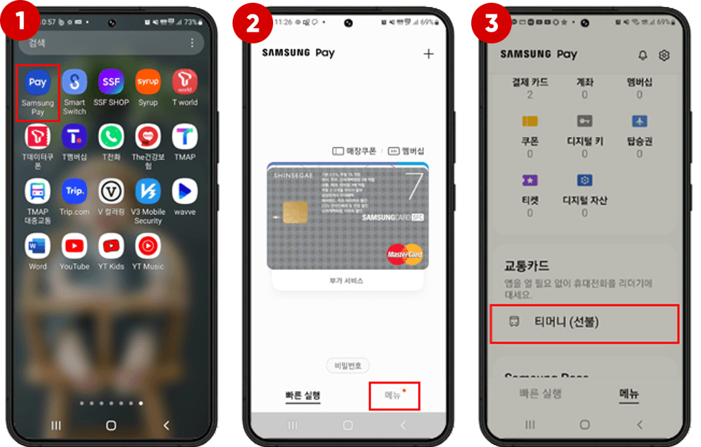 : Samsung Pay 티머니 후불교통카드를 이용하는 경우, 절전모드에서 교통카드 상태를 확인 할 수 없어 미승인 오류가 발생할 수 있습니다. 원활하게 사용하기 위해서는 휴대폰의 절전 모드를 해제 후 사용하는 것을 추천!