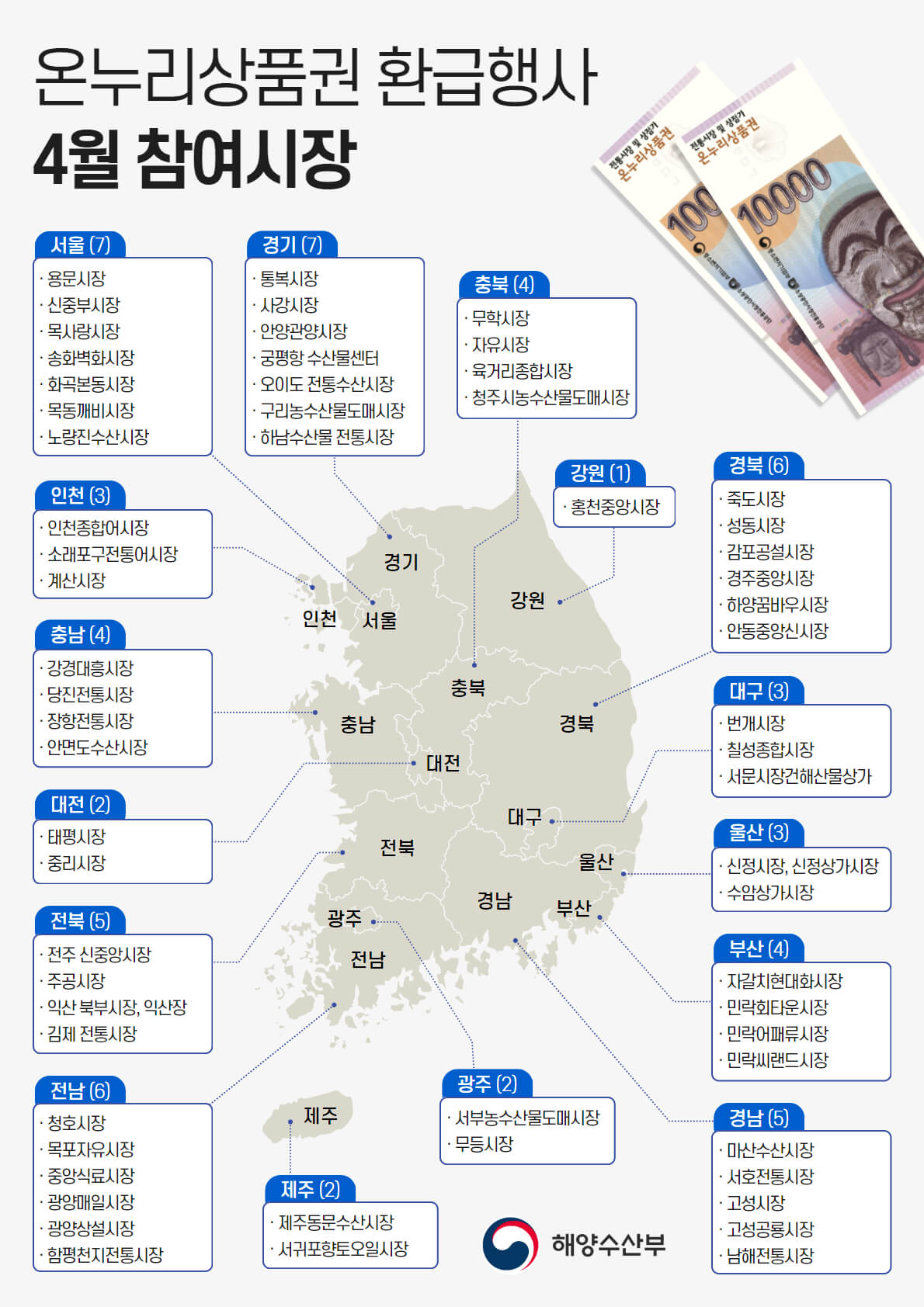 수산대전 쿠폰 뿐만 아니라 수산물주요소비처인 전통시장에서 온누리상품권 환급행사도 계속하여 진행됩니다. 또한 제로페이 수산물 전용 모바일상품권을 할인하여 발행하는 등 다양한 할인혜택을 지원하고 있는데요. 4월 온누리상품권 환급행사’는 전국 64개 전통시장에서 4월 6일(토)부터 19일(금)까지만 진행합니다!