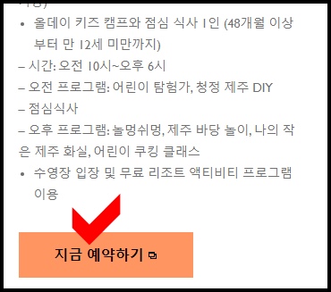 ※ 패키지 고객은 이미 숙박요금을 결제한 시점에 키즈프로그램 금액이 모두 포함되서 결제가 됩니다. 그런데, 키즈프로그램을 온라인으로 사전예약하려고 하면 2만원이든, 3만원이든 자꾸 프로그램 금액을 결제하라는 창이 뜰겁니다. 그래서 패키지 고객은 전화(064-803-7773)로 예약 문의하셔야 해요.