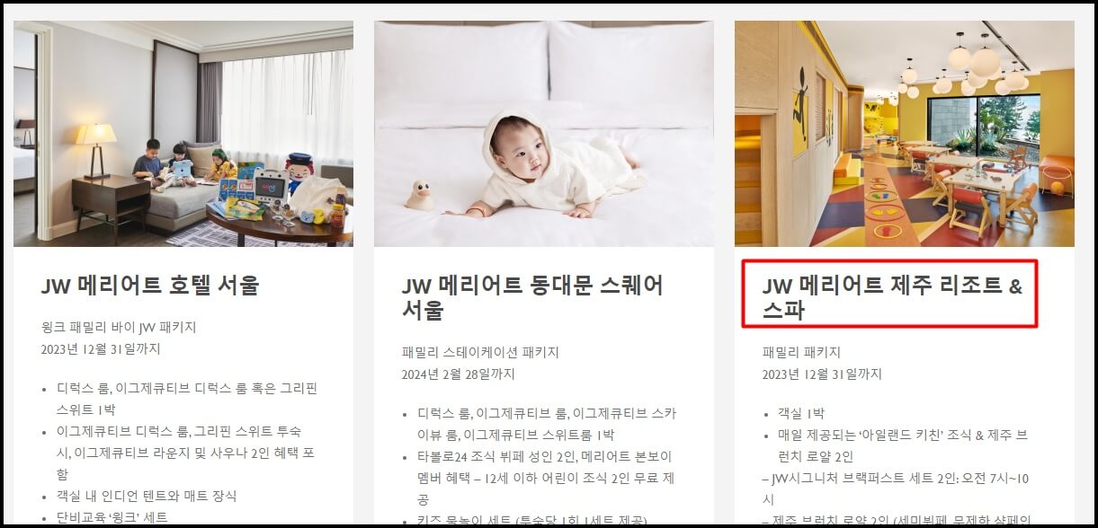 : 내가 원하는 날짜의 패밀리패키지 요금을 자세히 알고 싶다면 위의 사이트로 이동 후, "JW 메리어트 제주 리조트 & 스파" 부분의 '지금예약하기'를 누릅니다. (원하는 날짜의 객실별 패밀리패키지 요금 확인 가능)