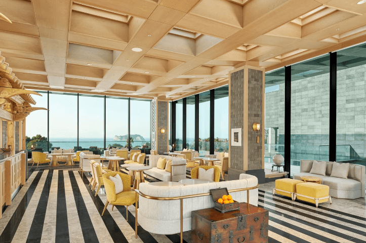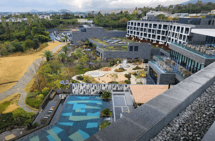 곳곳에 배치되어있는 제주도스러운? 건축물이나 조경, 미술작품도 재밌는 눈요기가 되었지만, 가장 훌륭한 건 전망이였는데요. 창밖으로 보이는 주상절리 해안절벽과 짙은 초록나무와 바다가 '아... 이게 바로 제주도지.' 하는 소리가 절로 나오게 했어요. 특히 메리어트에서 자랑하는 범섬 바다 뷰를 제대로 즐기려면 루프탑이 있는 가장 꼭대기 8층도 꼭 방문해보셔야합니다. 우리나라 서귀포가 참 아름답다는 걸 느낄 수 있어요.